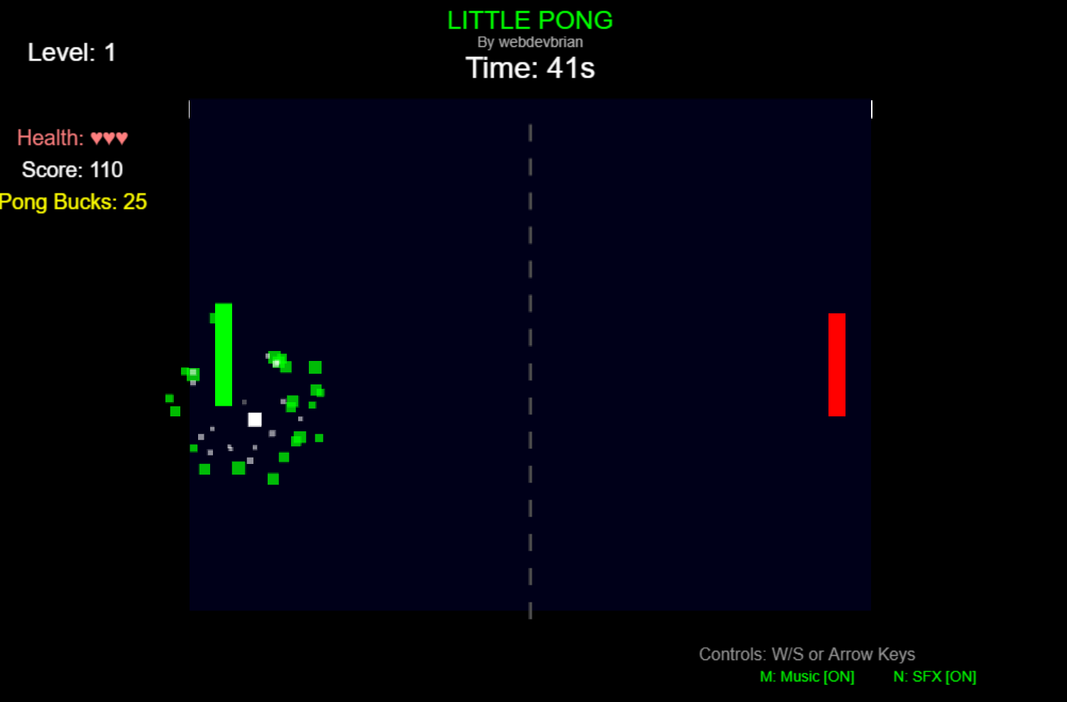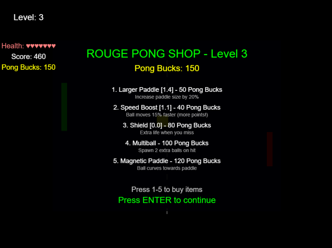 - You have 60 seconds in each level, after which if you survive, you are able to buff your pong paddle and experience with things like size, ball speed and shields.